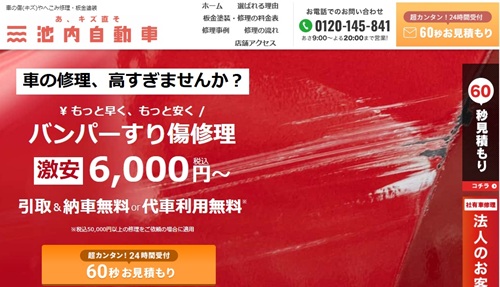 「池内自動車」は、国内に複数の店舗を展開する板金塗装業者です。一般的に板金塗装では高級車や輸入車などは追加料金が発生しがちですが、こちらではどのような車であってもキズのサイズに基づいた均一価格で施工が可能です。